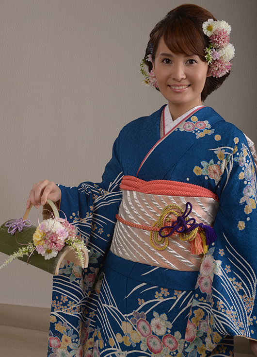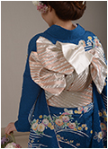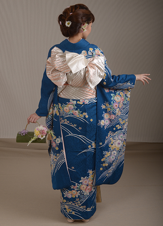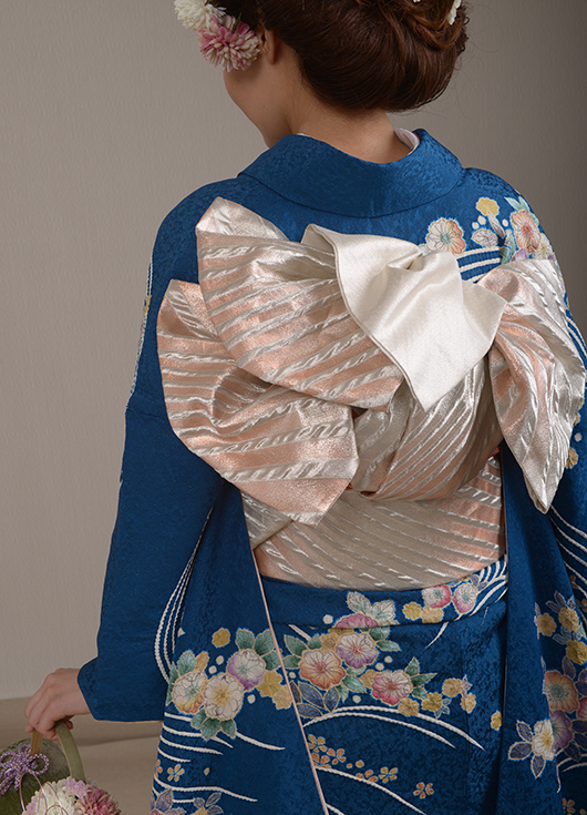 金糸が織り込まれた青地に上品な花模様。銀とピンクのふくれ織り帯で華やかに大きめの結びを。竹のバックブーケ。ピンクの和小花をヘアーに散らして全体的に上品にまとめて。