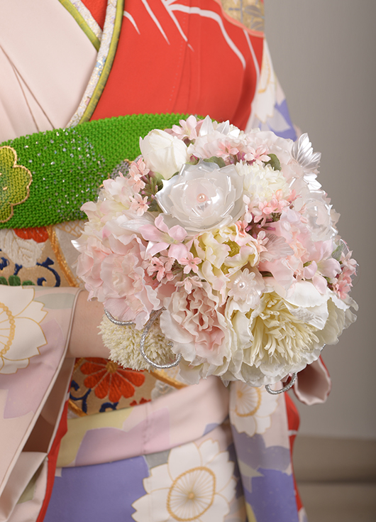 少しポップにも見える柄の珍しい振袖。古典柄の帯でふくら雀結び、緑の帯揚げで可愛らしくまとめて。桃色芍薬と和かんざしのラウンドブーケ。高島田結に使うかんざしをアレンジしヘアーに飾って和を強調。