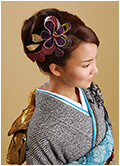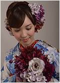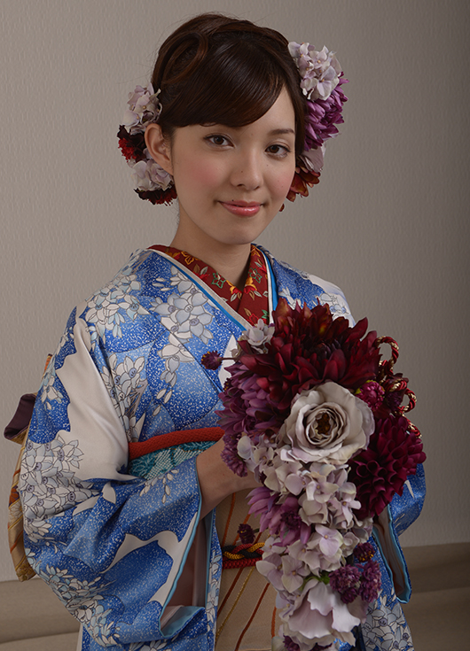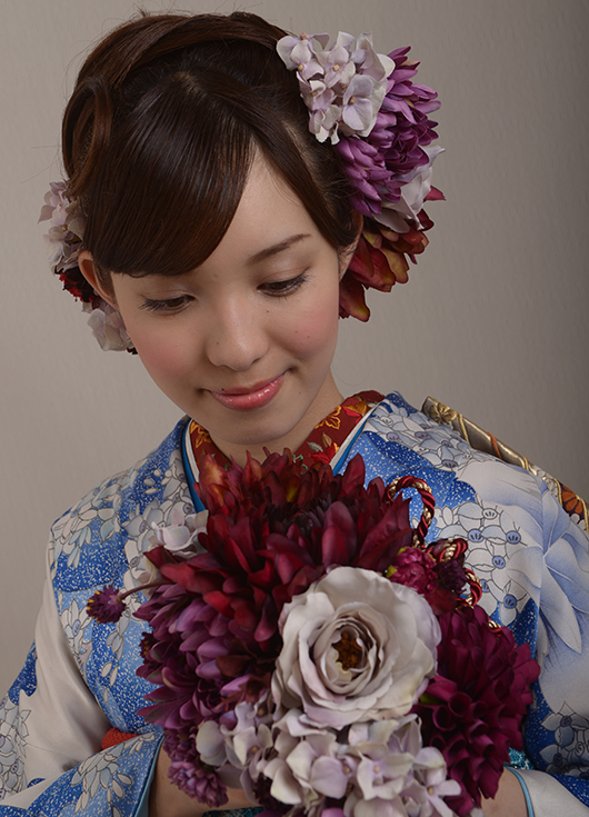 バラの現代柄ですが、古典柄の帯と半衿・帯揚げに小豆色のアクセントカラーを入れて個性的なコーディネイトに。薄紫と小豆色のティアドロップブーケ。薄紫バラ・アジサイ、小豆色のダリア・菊など、ヘアーにもアクセントカラーをたくさん飾って、派手ではない統一感を。