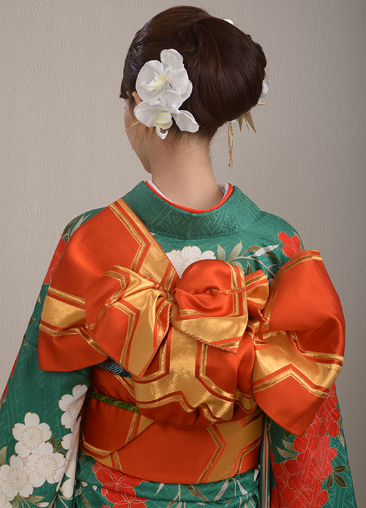 とてもインパクトある紅白の枝垂れ桜。オレンジ色の帯で若々しさを表現。胡蝶蘭・金笹・金稲穂のシャワーブーケ。白の胡蝶蘭をヘアーに使うことによって清楚さを表現。