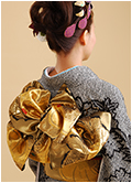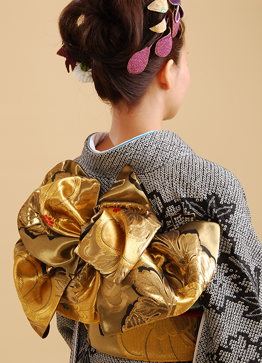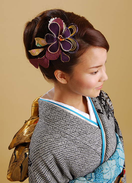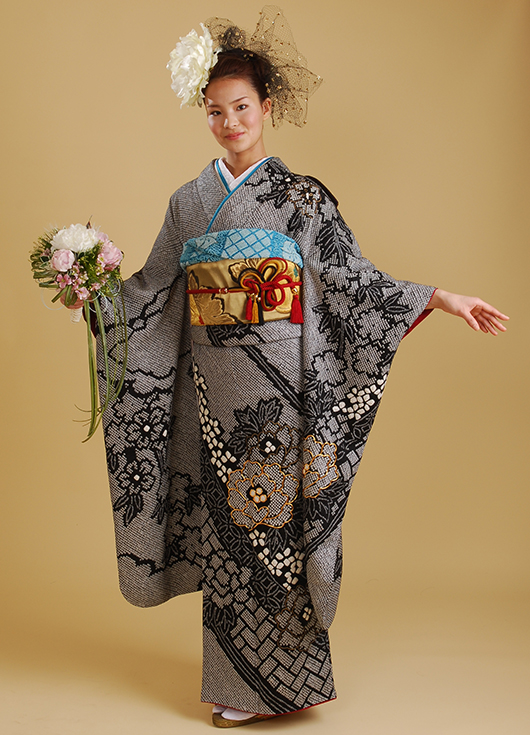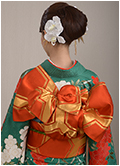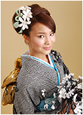 落ち着いたイメージになりがちな黒絞りの振袖もターコイズブルーの伊達衿や帯揚げを使って。自分に合うコーディネイトを提案します。牡丹とグリーンのクラッチブーケ。白・大輪の牡丹をすっきりとまとめたヘアーに一輪、黒と金のチュールネットをバックスタイルに華やかに散らして。ヘアーコサージュも多彩。布で作った紫や白の花を付けて可憐な雰囲気に。